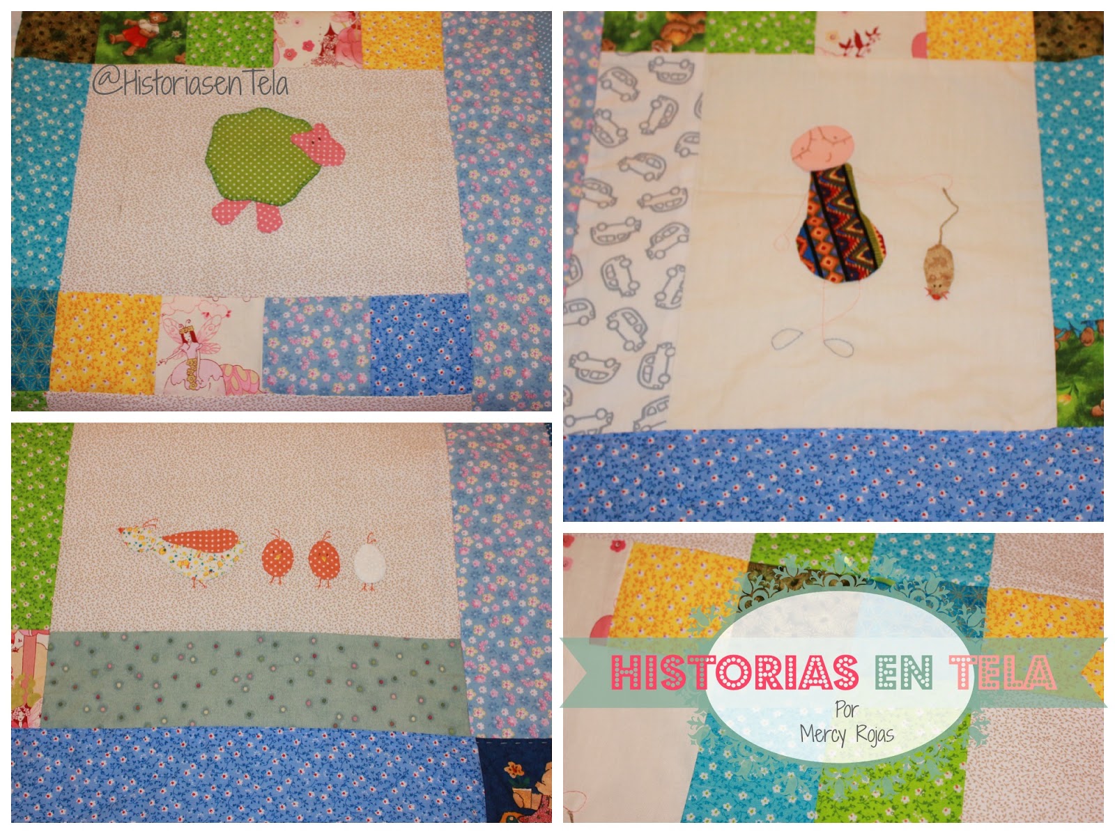 Para esta manta se unieron Lola, Sonia, Nacho y María Fe; donaron sus telas he hicimos este proyecto colectivo. La historia que cree cuenta la visita de Jaré a una granja y las cosas que vio allí: